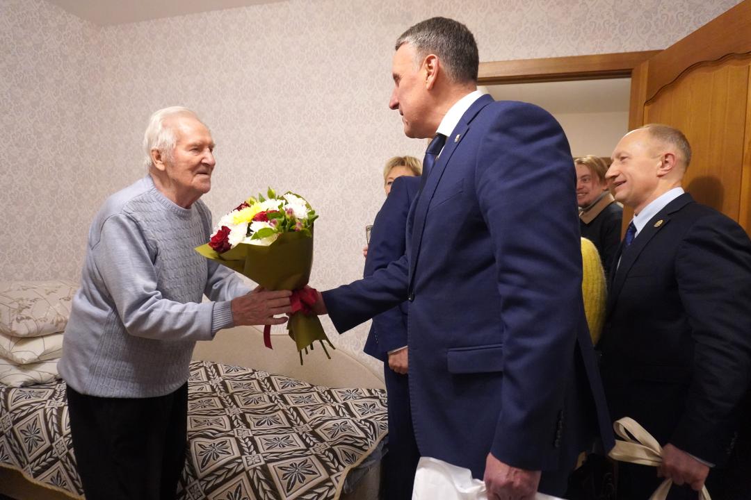 Юбиляра поздравили, пожелали здоровья на долгие годы, вручили букет цветов и подарок Первый заместитель Губернатора Новгородской области Евгений Богданов и мэр Великого Новгорода Александр Розбаум. Николаю Васильевичу передали именную поздравительную открытку от Президента Российской Федерации Владимира Путина.